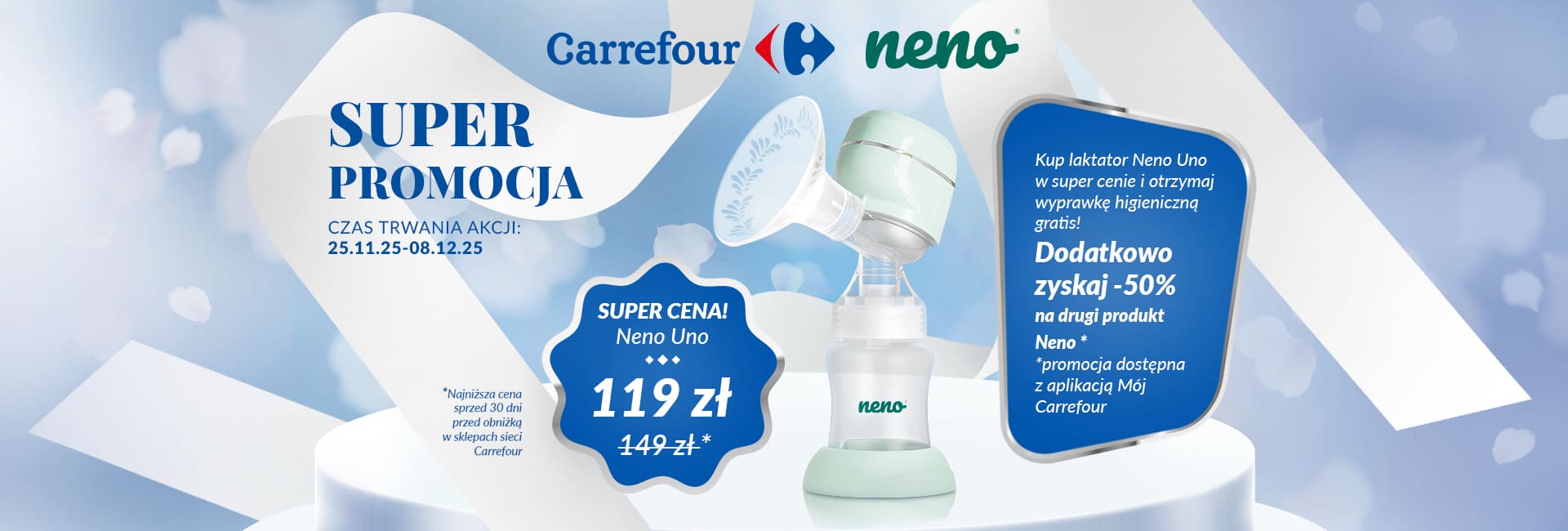 W jaki sposób możesz skorzystać z akcji? Wystarczy, że masz aktywną aplikację Mój Carrefour, aktywujesz dostępne w niej kupony, a następnie dokonasz zakupu laktatora Neno Uno stacjonarnie w sklepach Carrefour * w dniach 25.11-8.12. Paragon z zakupu należy zarejestrować na naszej stronie: kgktrend.pl/kampania-neno-w-carrefourze w ciągu 14 dni kalendarzowych od dnia zakupu.